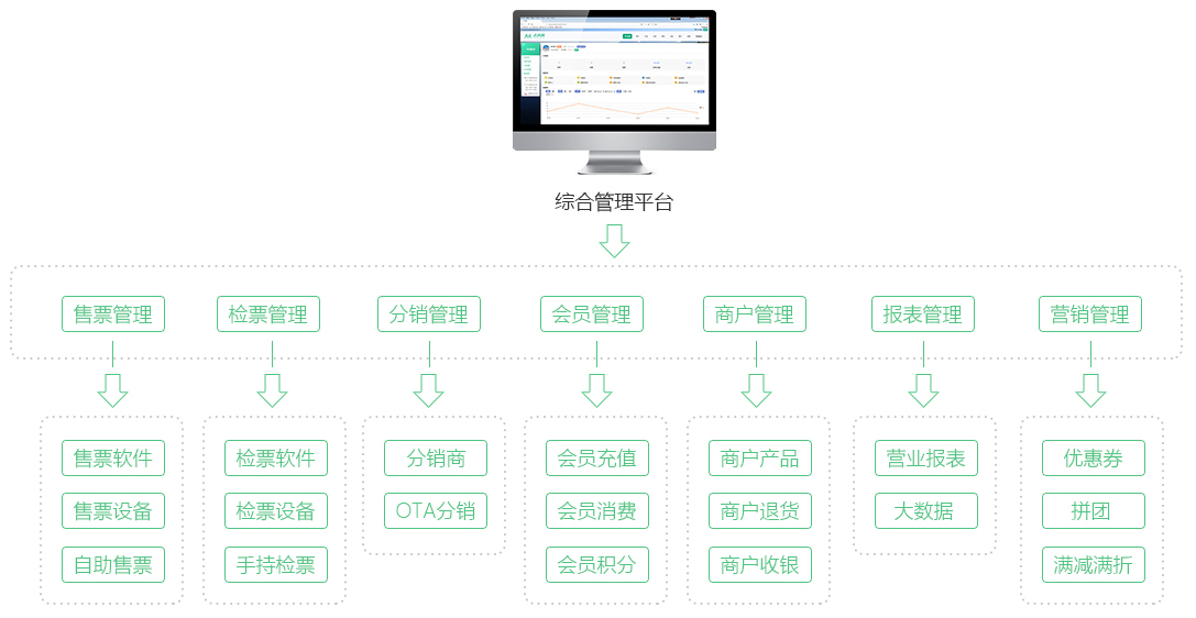 建立智慧景區綜合管理平臺,通過信息化系統實現售票管理、驗票管理、 自助售驗票管理、會員年卡管理、工作人員出入考勤管理、商品紀念品 售賣管理、景區設施計時租賃管理、財務管理等,系統提供強大的數據統計分析功能和 遠程報表、手機報表功能,使管理者能夠直觀、及時的掌握運營數據,實現科學決策和科學管理。